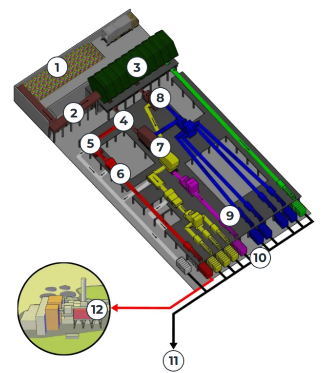 12 – Sorting rejects are removed throughout the sorting process. They are either redirected to energy recovery units to be incinerated and converted into energy or sent to landfill sites for disposal.